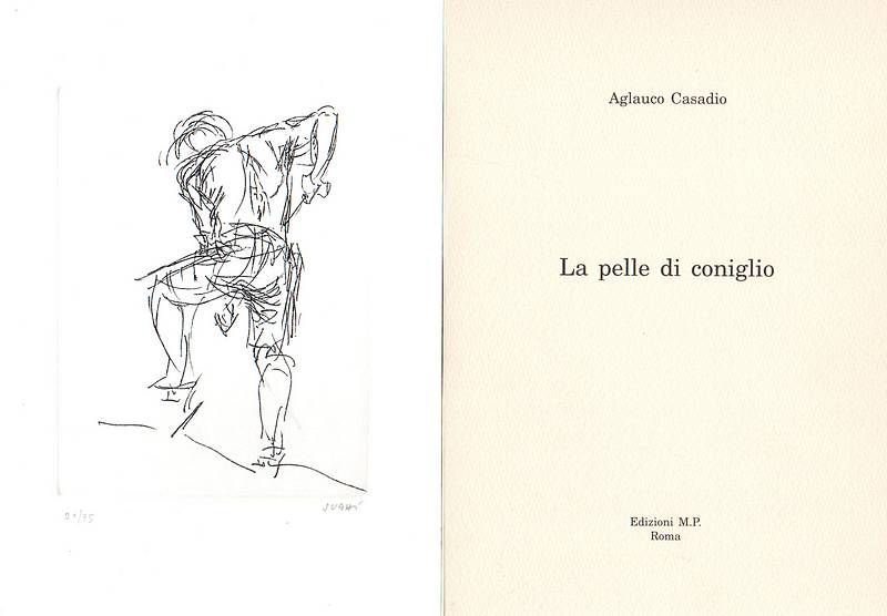 Cartella In-16° contenente 9 fogli ripiegati, ognuno con una poesia di Casadio ed un disegno a fronte. Altri due fogli, uno di frontespizio e l'altro di colophon. Impressa a cura della Tip. Caradossi per le Edizioni M.P. Edizione fuori commercio con un'acquaforte di Moussa Abdayem firmata e numerata da 1 a 75. La presente è la n° 64/75.