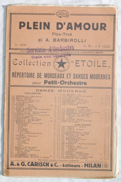 In 8. cm 27x17,5. Pp. 12. Partitura completa per orchestra senza data ma degli anni '30 di una canzone. Caratteristica copertina decorata dell'epoca. Discrete condizioni, fioriture e margini usurati. a complete score for orchestra of not dated but of 1930's. Carachteristic decorated cover of that period. Fair conditions, foxings and worn edges.
