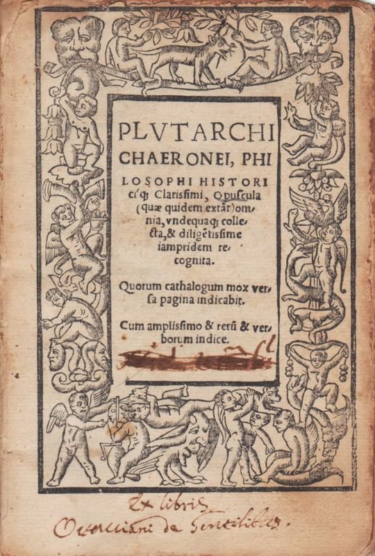 In-8° (cm 15,5 x 10,3 ca.), legatura coeva su tre nervi, con brossura muta e tit. ms. su etichetta al dorso; cc. non num. 32 (front. e indici), cc. num. 536. Gli interpreti traduttori dei vari scritti plutarchei sono: Willibald Pirckheimer, Guillaume Budé, Erasmo, Niccolò Sagundino, Carlo Valgulio, Guarino Veronese, Poliziano, Raffaele Regio, Ottmar Luscinius, Filippo Melantone. I nomi di Prickheimer, Melantone ed Erasmo sono anticamente cassati sia all’indice che ai titoli in testa alle carte. Frontespizio xilografico, ove il titolo è inscritto in una ricca fantasiosa cornice con putti, grotteschi, e allegorie degli argomenti trattati. Alla c. 63 un diagramma musicale illustra la divisione dell'ottava; foglioline incise come testatine ad ogni capitolo. L'impresa tipografica del Sessa, incorporata alla parte superiore della cornice del frontespizio, è ripetuta, in forma più classica, all'ultima pagina, sotto il colophon, dove si legge: 'Venetiis per Io. Ant. & fratres de fabio, sumptu & requisitione D. Melchioris Sessa. Anno dn̄i MDXXXII. Mese Martio.' Testo in tondo su trentaquattro linee. Esemplare riccamente glossato da mano coeva, con bella grafia; in particolare la parte di Apophtegmata Imperatorum e Apophtegmata Laconica, curata da Raffaele Regio (cc. 121-185). Altre carte glossate sono: 193-195 e 305-312. Al margine inferiore del frontespizio ex-libris cinquecentesco manoscritto “Octaviani de Gentilibus”. Il volume raccoglie quarantadue dei settantotto brevi trattati che tradizionalmente vanno sotto il nome di Moralia - eccone un elenco parziale: De virtute morali, De invidia et odio, De musica, Mulierum virtutes, De liberis educandis, Apophtegmata, Bruta animalia ratione utantur, Consolatio ad Apollonium, De exilio, De tranquillitate animi, De fortuna Romanorum, De fortuna Alexandri vel virtute, De placitis philosophorum, De his qui tardea numine corripiuntur, Quomodo adulator ab amico internoscatur, De capienda ex inimicis utilitate, De cupiditate divitiarum, De cohibenda iracunda, Cum principe philosophandum, De nota Pythagorica, Quod docenda sit virtus, De fortuna, De auditoris officio, De amicitia in multos diffusa, Num improbitas sufficiat ad infelicitatem. Alla fine altri due testi: Carolus Valgulius in Plutarchi Musicam. Stephanus Niger de fraterna benevolentia. Una sola copia nelle biblioteche italiane (Milano, Università Cattolica del Sacro Cuore) Soltanto il primo foglio ha minime mancanze ai margini (come si vede in foto); le cc. da 55 a 66 hanno forellini di tarlo al margine interno, adiacente alla cucitura; per il resto ottimo esemplare, abbastanza marginoso e fresco, e su carta croccante; impreziosito dalle glosse.