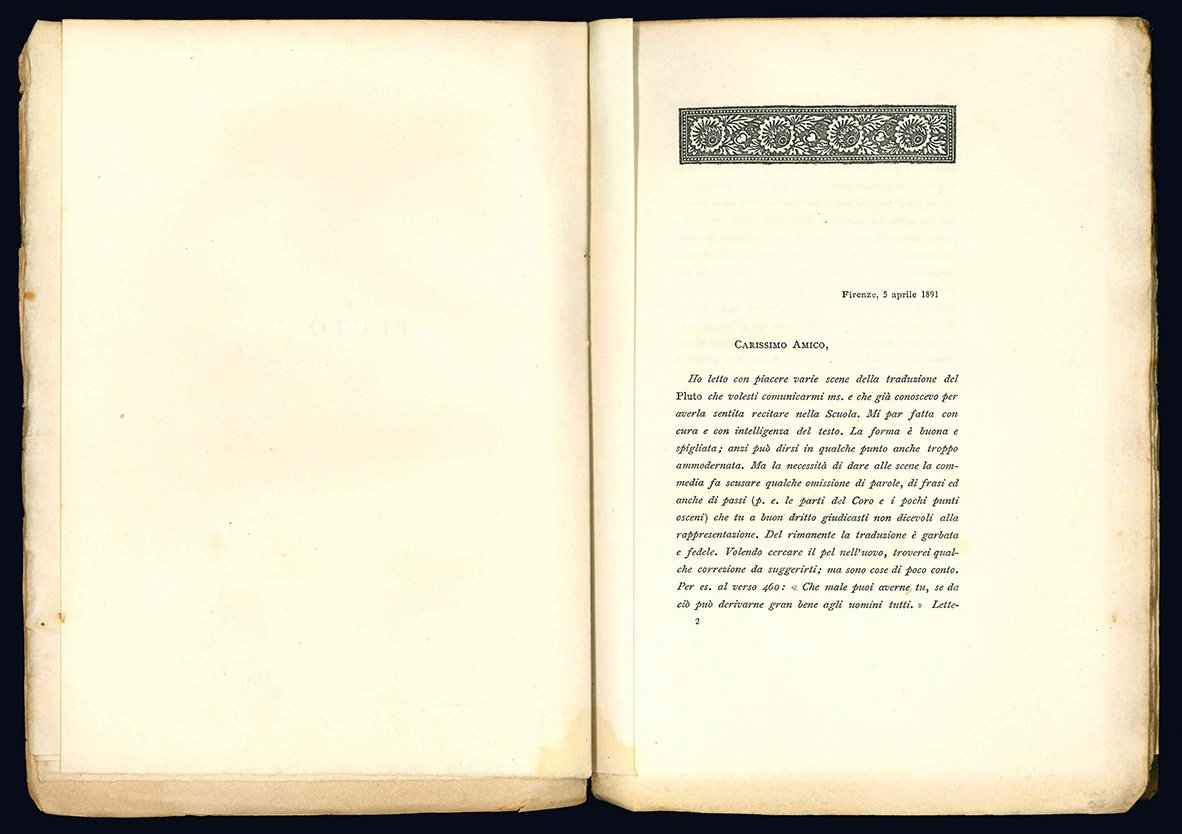 Copertina editoriale. Minime mancanze marginali e al dorso. Bella edizione dalla curata veste grafica su carta di gran pregio. Bell'esemplare intonso a fogli chiusi di questo classico della commedia greca volgarizzato dall'attore, drammaturgo e storico ravennate Luigi Rasi e accompagnato da un prologo e da una lettera dello storico, giurista e letterato fiorentino Augusto Franchetti.