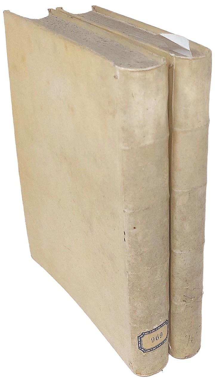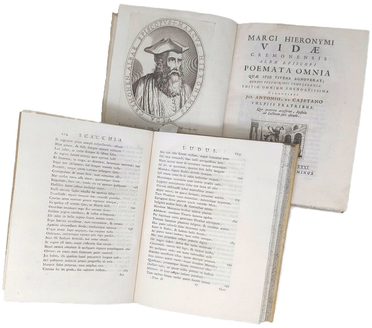 >2 vol. (il secondo in 2 parti) in-4, pp. XX, 436; XVI, 183, (1); 178, (2); legatura coeva p. pergamena. Con un bel ritrattto dell'a. in ovale finem. inc. in rame da M. Heylbrouck, testatina inc. con medaglia del Vida all'inizio del II vol., impresa tipogr. su entramb i tit., stemma dei Volpi, testatine, finaletti ed iniz. silogr. Magnifica edizione collettiva, ricca e molto stimata, nitidamente impressa e filologicamente corretta ad opera dei fratelli Volpi. Comprende: ''Christiados libri sex'' preceduti dagli argomenti scritti in latino da G. Aug. Botta (poema della Redenzione divina); ''Hymni de rebus divinis''; ''Poeticorum libri tres'' preceduti dalla dedica del Vida alla città di Cremona e dalla prefazione di Paolo Tartesio (una sorta di ''ars poetica'' del Rinascimento); ''Bombicum libri duo'' (sulla coltura dei bachi da seta); ''Scacchia ludus'' (parodia mitologica con protagonisti Apollo e Mercurio); ''Carmina diversi generis''; ''Dialogi de Reipublicae dignitate, seu civilis societatis, ad Reginaldum Polum Cardinalem''; in fine alcune lettere di Vida, in latino ed in volgare, ad illustri personaggi del tempo e di Bembo, Sadoleto e Calcagnini al Vida. Chiude la ''Appendix'' con lodi e notizie bio-bibliografiche dell'autore. Marco Gerolamo Vida (Cremona 1490 - Alba 1566) fu dotto umanista e stimato poeta neolatino, vescovo di Alba fin da l 1532, tra i più facondi e preparati partecipanti al Concilio di Trento. Esemplare perfetto, ex-libris araldico ai contropiatti. Volpi, Stamperia Cominiana, p. 518. Brunet V, 1181: «Bonne édition, la plus correcte et la plus recherchée». Graesse VII, 302. Choix d'Olschki VIII, 12459.
