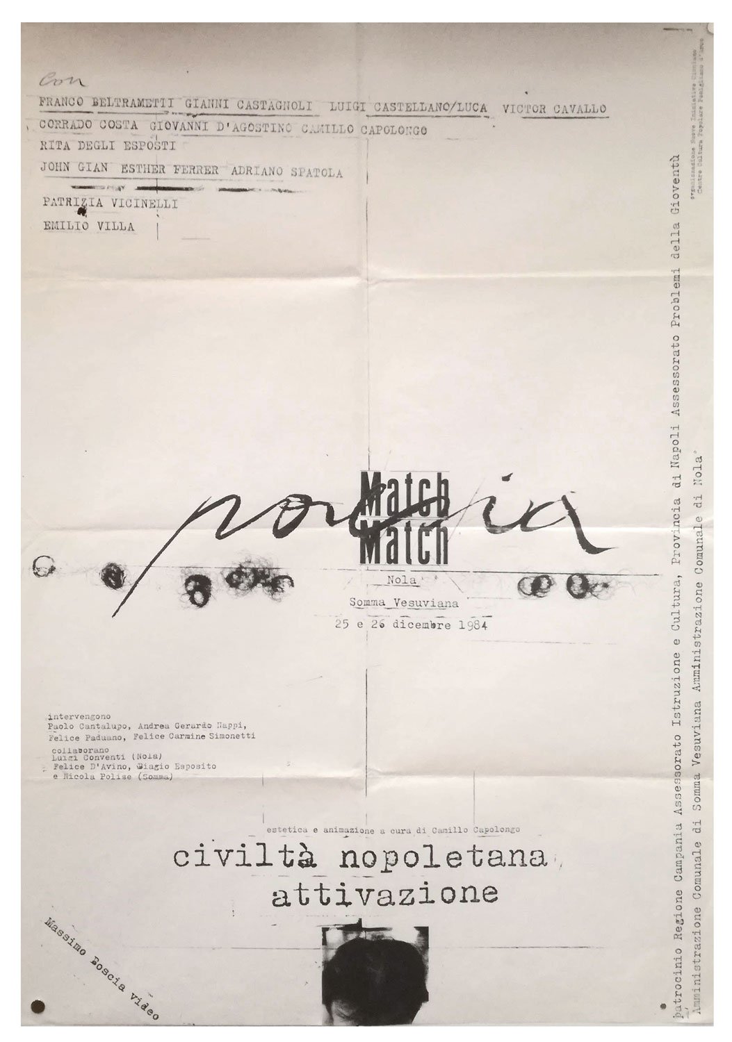 MANIFESTOManifesto originale.Ottimo esemplare.Poster realizzato per la mostra «Match Match», organizzata da Nuove Iniziative Cicciano. Centro Culturale Popolare Pomigliano d’Arco. Con Franco Beltrametti, Gianni Castagnoli, Luigi Castellano/Luca, Victor Cavallo, Corrado Costa, Giovanni D’Agostino, Camillo Capolongo, Rita degli Esposti, Adriano Spatola, Patrizia Vicinelli, Emilio Villa.