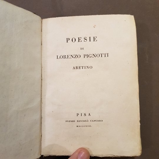 Poesie di Lorenzo Pignotti aretino. segue: Pignotti. La treccia donata poemetto eroi - comico. Firenze, Molini, 1808; segue:Imitazioni di satire di Giovenale e d'Orazio. Pisa, Capurro, 1817