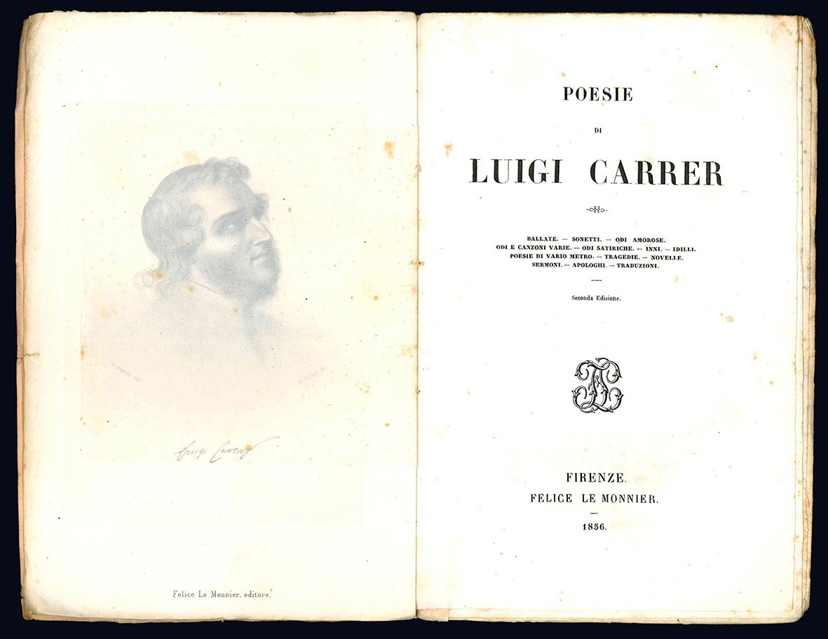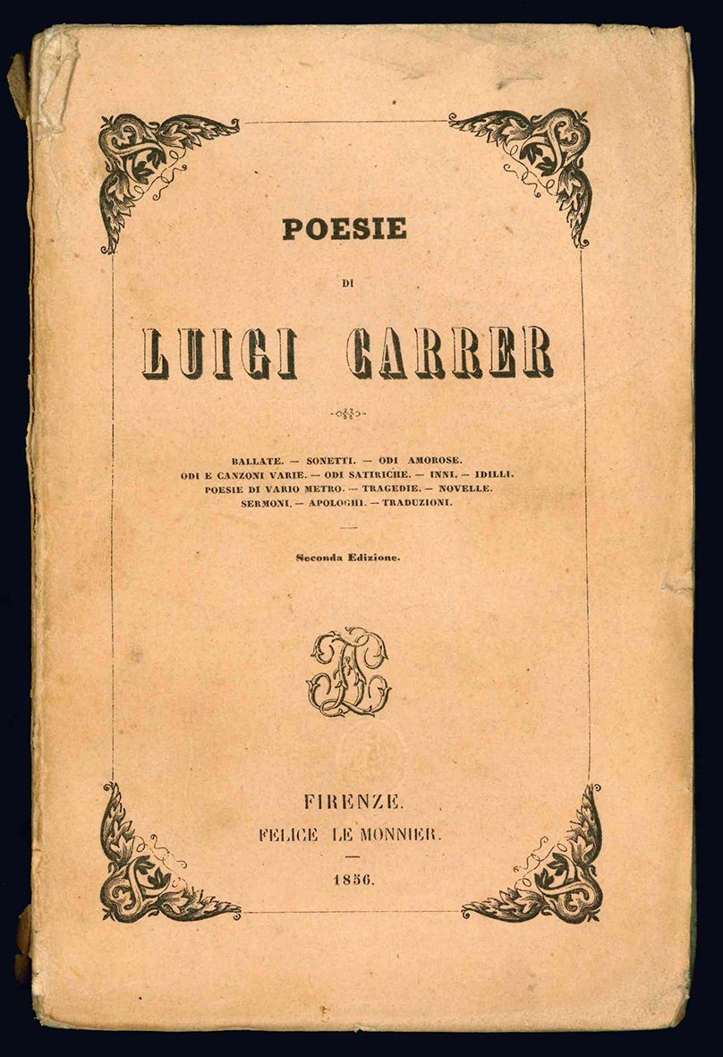 In 16mo (mm 186x122); pp. [4], XVI, 638, [1] c. di tav. fuori testo. Occhietto, ritratto di Luigi Carrer all'antiporta. Fioriture diffuse.