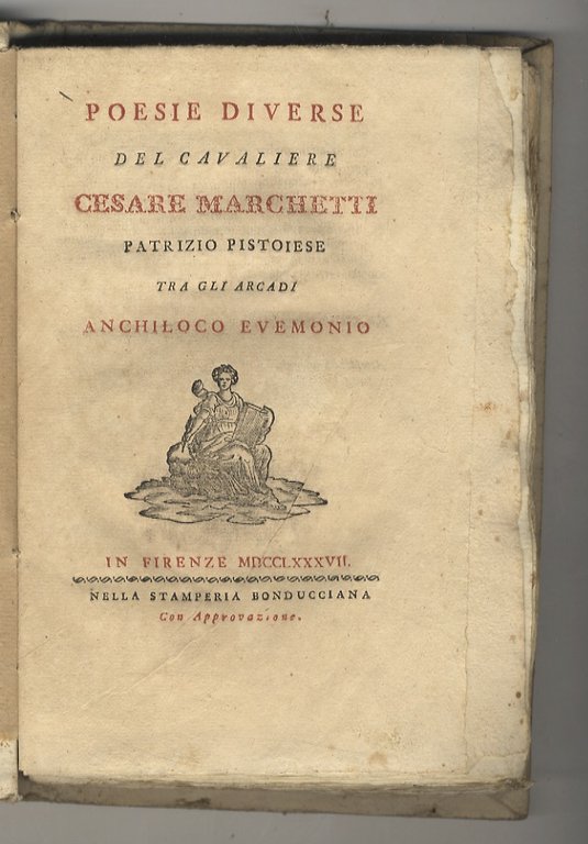 In Firenze, nella Stamperia Bonducciana, 1787, in-8, cartone rustico coevo, titolo calligrafato al dorso, pp. 260. Frontespizio in rosso e nero con vignetta in xilografia, come fregi e finali. Elegante edizione impressa su carta vergellata per queste poesie, in prevalenza d'occasione. La famiglia Marchetti, nel ramo pistoiese, fu fra le più eminenti, come ancora attesta il bel palazzo cittadino.