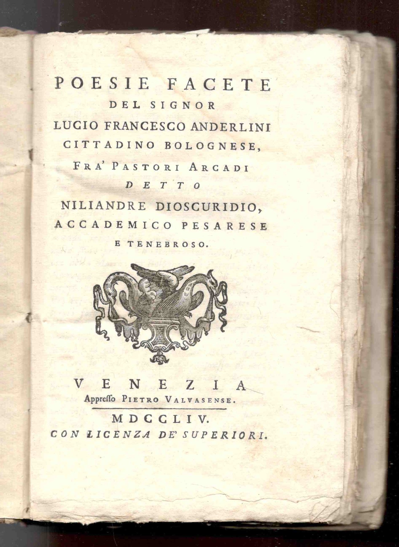 Poesie facete del sig. L.F.A. cittadino bolognese fra pastori arcadi detto Niliandre Dioscuridio, accademico pesarese e tenebroso | Libri antichi e moderni | Anderlini, Lucio Francesco