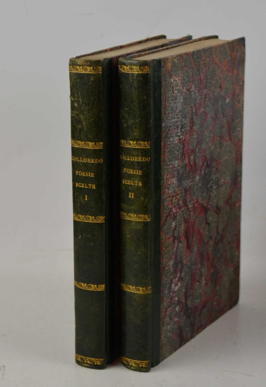 Tre parti in due volumi di cm. 23, pp. xxvi, 256; 192, 80. Bella legatura coeva in mezza pelle verde con punte, titoli e fregi in oro al dorso, piatti marmorizzati. Bell'esemplare, fresco, marginoso e genuino. Seconda edizione. Ermes di Colleredo nato a Monte Albano nel 1623, morto a Gorizzo nel 1692 viene considerato il padre della letteratura friulana di lingua latina, poeta realistico, satirico, burlesco. Le 80 pagine della terza parte contengono l'addenda delle poesie del Zoruzzi.