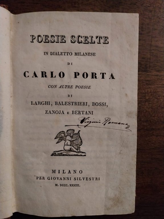 In-16°, pp. VIII, 316 ritratto in antiporta, legatura coeva in mezza pelle con titolo al dorso. Prima edizione di questa interessante miscellanea di poeti milanesi. La sezione di Porta ricalca fedelmente l’edizione del 1827 ed è seguita dagli altri componimenti, disposti senza ordine metrico.
