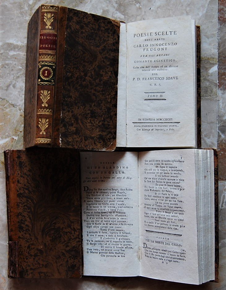 Dalla Stamperia di Giacomo Storti, 1793. In-16, 4 volumi, mezza pelle, con titolo e fregi oro al dorso, pp. 298: 288: 264: 227. In buono stato.