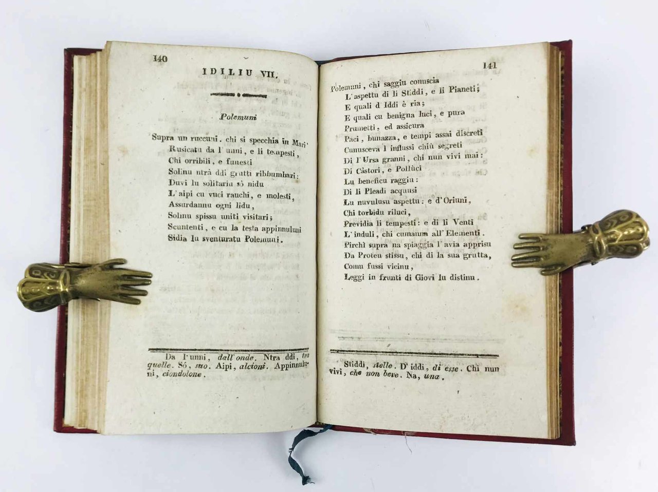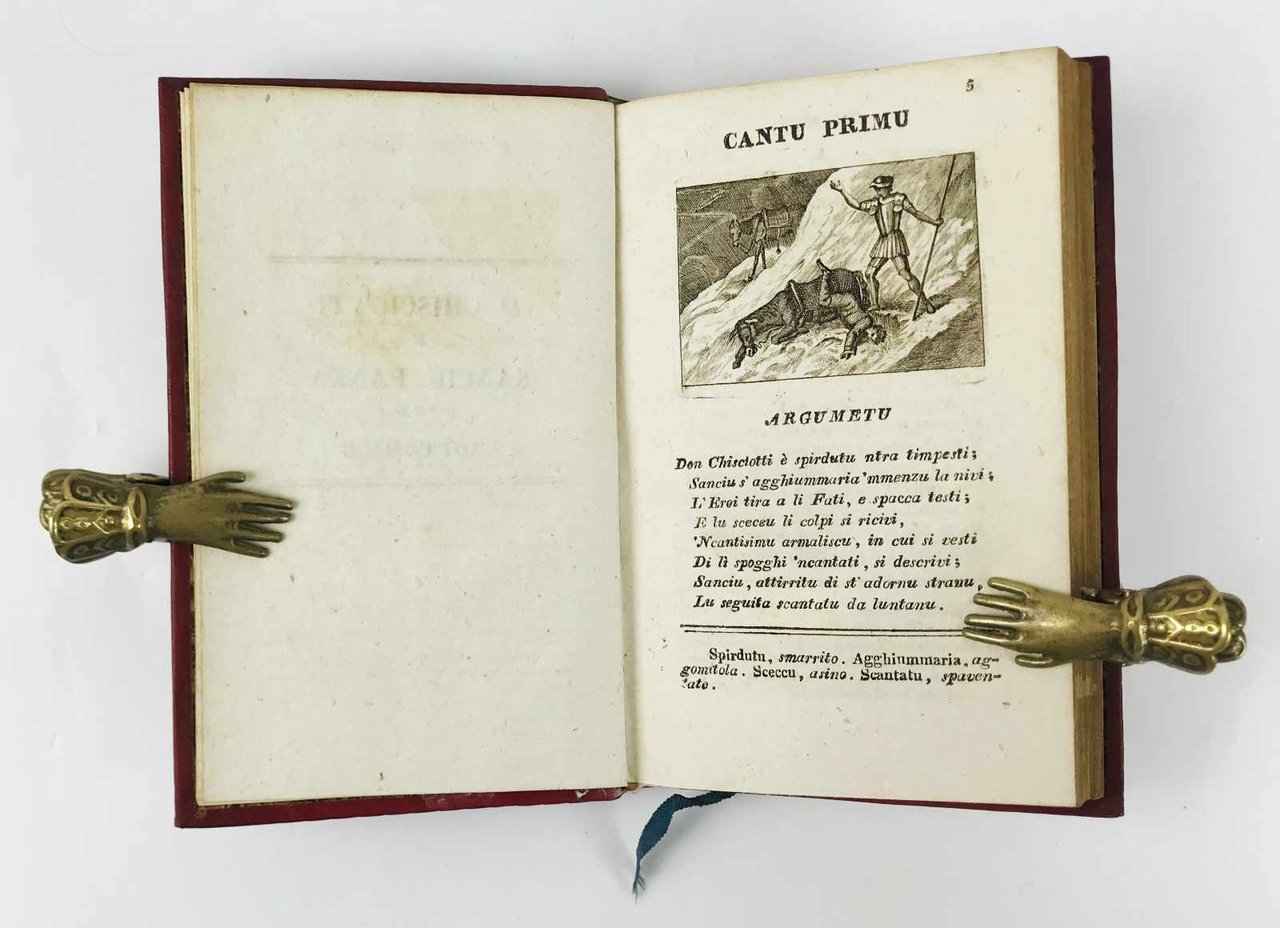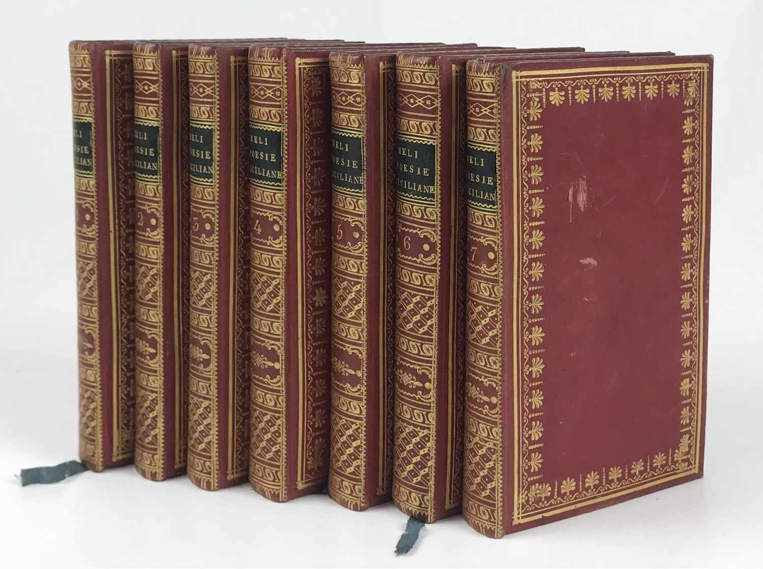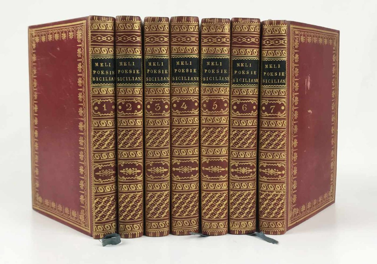 LIBROPrima edizione della raccolta in parte originale.Splendidi esemplari. Dedica d’appartenenza coeva “.en souvenir leur voyage de Sicile” foglietto manoscritto del legatore, con l’indicazione del lavoro.Ritratto dell’autore in ovale in antiporta ad opera di F. Costanzo. Il Meli (1740-1815) pubblicò questa edizione definitiva dopo quella in 5 volumi del 1787. Il quarto volume (Fate galanti) porta otto incisioni a mezza pagina del Di Bella (all’inizio di ogni canto). I volumi 5 e 6 (Don Chisciotti e Sanciu Panza) sono pure illustrati con 12 belle incisioni a mezza pagina (sempre 1 per canto), di mano diversa ma su disegno del Patania, ad hoc (vol. VI, pag. 260, nota). I versi del settimo volume (Poesii e Favuli) sono in prima edizione; in ultima pagina il decreto di esclusiva concesso poco dopo la stampa dell’opera, in data 21.1.1815. Edizione in parte originale anche nelle note. E questa l’opera curata dal Meli in vita; le “Poesie siciliane” contrabbandate come parte dell’opera (o come ottavo volume) uscirono in realtà postume nel 1826 presso il Baldanza.