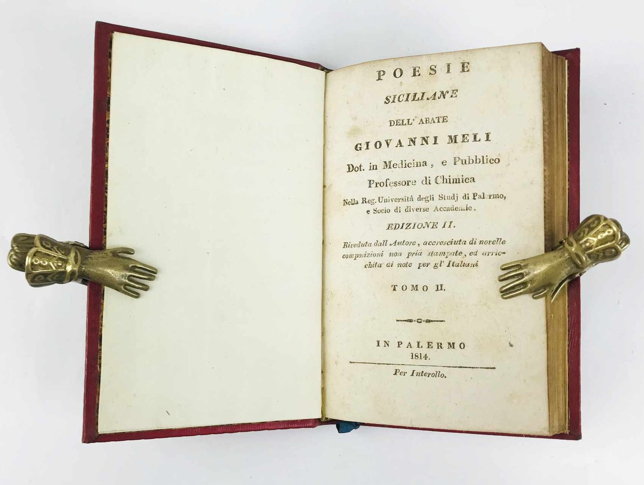 Poesie siciliane dell’Abate Giovanni Meli dot. in Medicina, e Pubblico Professore di Chimica.edizione II riveduta dall’autore, accresciuta di novelle composizioni non pria stampate, ed arricchita di note per gl’Italiani