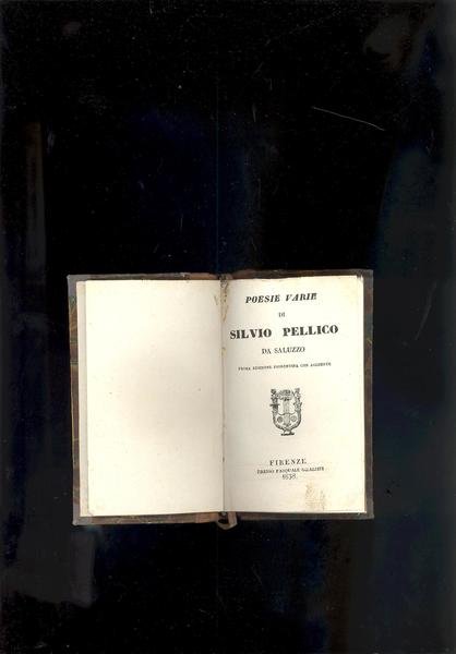 IN 24° ( cm.12 X 7,5 ), pp.192, LEGATURA COEVA IN MEZZA PELLE CON TITOLO IN ORO ENTRO<BR>TASSELLO E FREGI., PIATTI MARMORIZZATI RIGIDI. PRIMA EDIZIONE FIORENTINA CON AGGIUNTE DELLE POESIE VARIE DI SILVIO PELLICO DA SALUZZO, AL MARCHESE TANCRERDI FALLETTI DI BAROLO ED ALLA MARCHESA GIULIETTA NATA COLBERT SUA CONSORTE, OMAGGIO DELL'AUTORE. EDIZIONE RARA SFUGGITA AL CENSIMENTO DEL PARENTI.<BR>OTTIMA CONSERVAZIONE, MANTENUTO IL SEGNALIBRO ORIGINALE IN SETA. ID, 3701