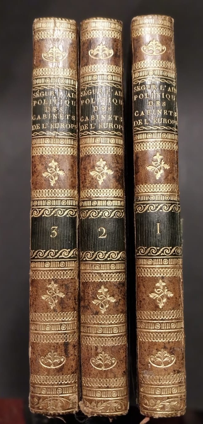 3 voll. in-8°, pp. (4), 399; (4), 404; (4), 435, bella legatura coeva in piena pelle, titolo su tassello e ricchi fregi in oro al dorso, dentelle all'unghiatura. Buona copia. L'opera contiene la corrispondenza segreta del conte Di Broglie sulla Politica di tutti i gabinetti d'Europa durante i regni di Luigi XV e Luigi XVI. Una fonte importante per la diplomazia e la politica del XVIII secolo.