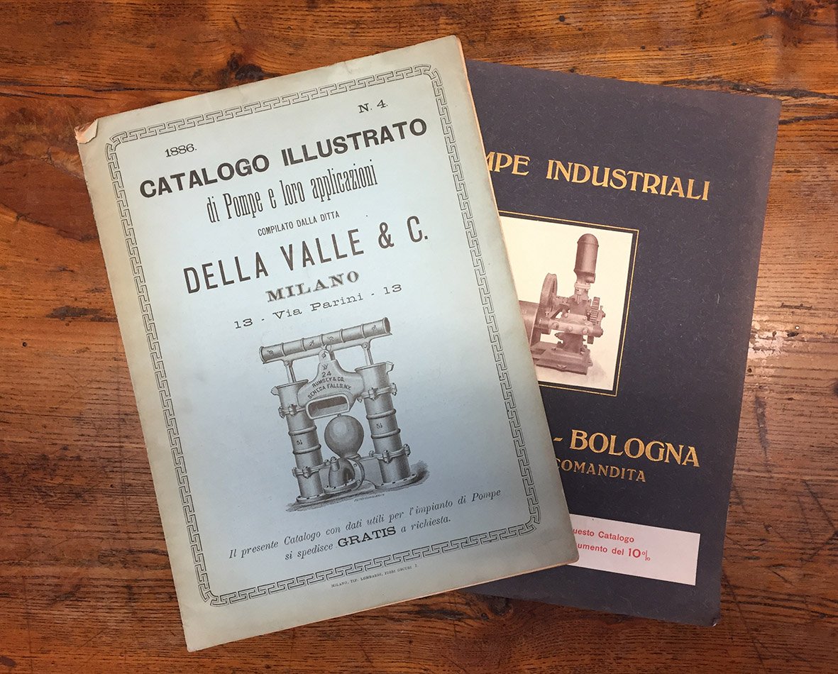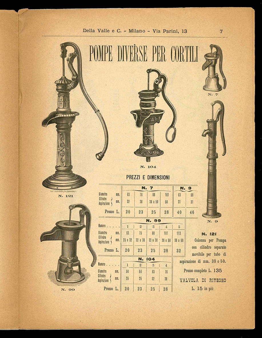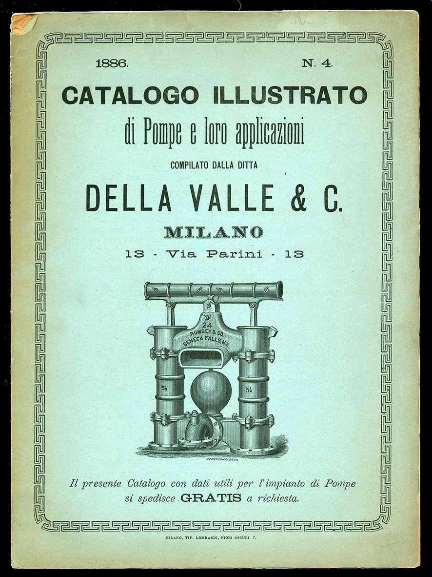 - Catalogo illustrato di pompe e loro applicazioni compilato dalla ditta Della Valle & C. N. 4. Milano: Tip. Lombardi, 1886. In folio (mm 311x229); pp. 20, con numerose illustrazioni e tabelle nel testo. Brossura editoriale azzurra. Copertine un po' sporche, carta uniformente brunita, piccoli strappi marginali a diverse carte che tuttavia rimangono ben distanti dal testo.