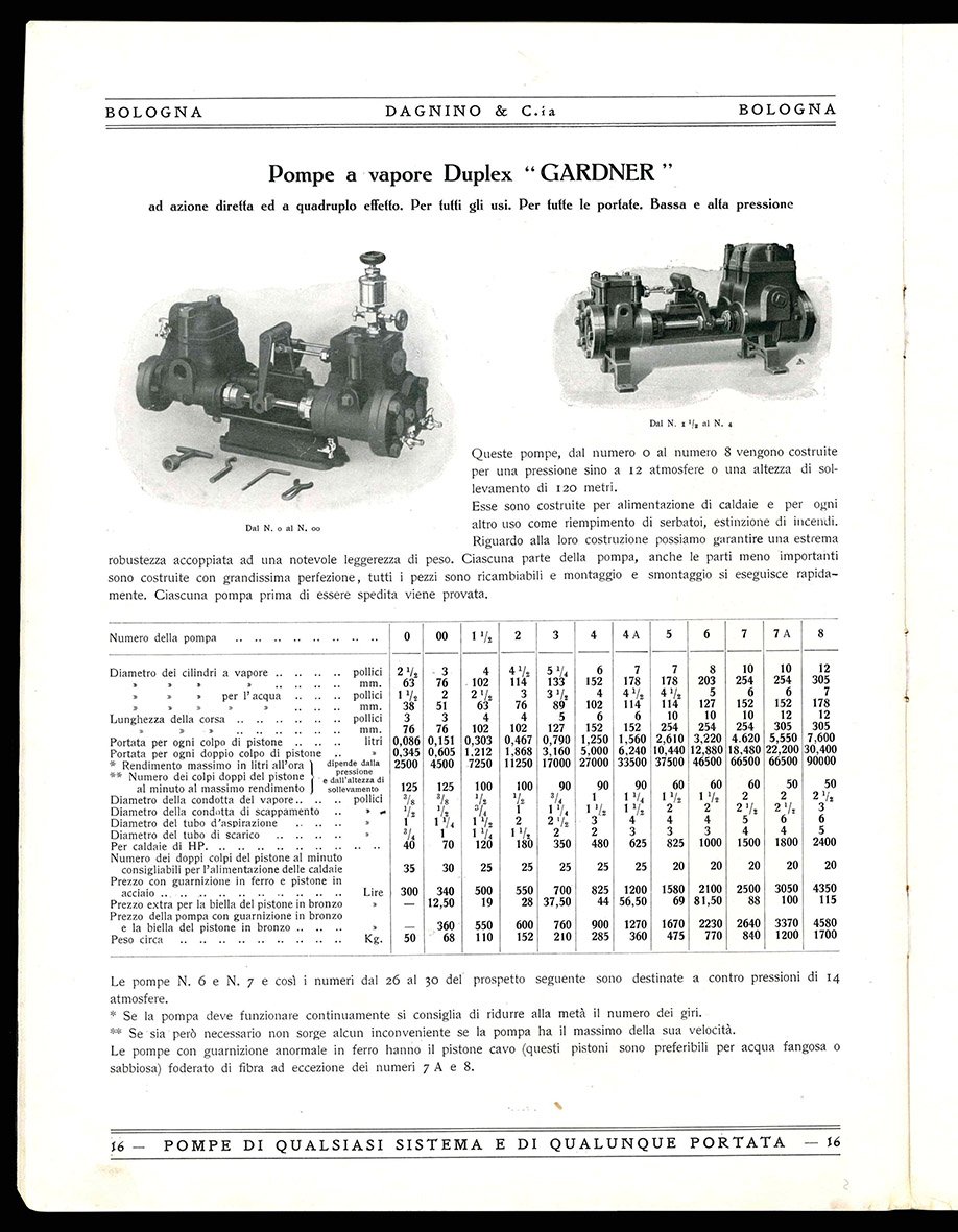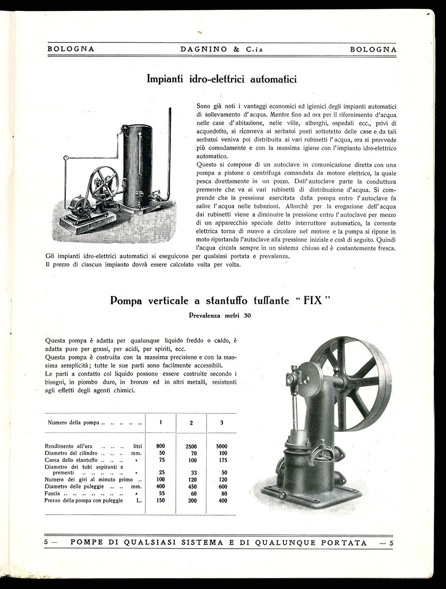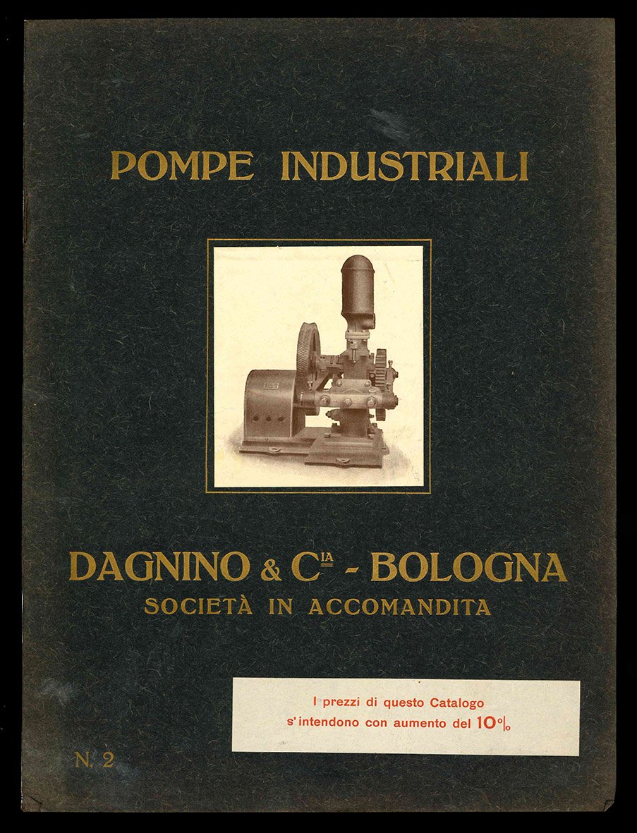 - Pompe industriali. Dagnino & C.ia - Bologna Società in accomandita. N. 2. Bologna: Officina grafica A. Cacciari. In folio (mm 308x230); pp. 35, [1]. Cartonato editoriale nero con titolo in oro e illustrazione di una pompa applicata sulla copertina anteriore.