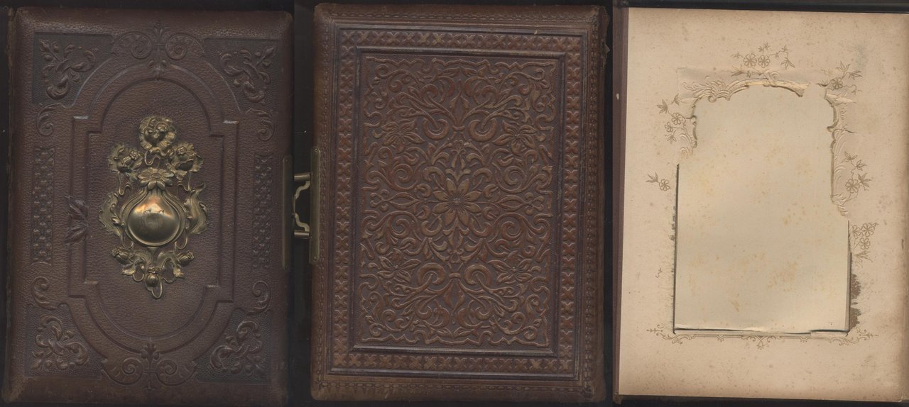 Portafotografie antico in pelle sbalzata a motivi floreali, cartiglio e chiusura in ottone