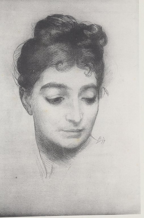 Imprimerie Champenois • pour CH. Masson • H. Piazza | Paris (Mars) 1899 | 21 x 29.50 cm | une feuille et une serpente | [ENGLISH DESCRIPTION ON DEMAND] | Rare lithographie originale en manière de crayon, exécutée par Félix Bracquemond pour L'Estampe Moderne, série numéro 23 publiée en mars 1899. Une des 50 épreuves de grand luxe tirées sur Japon à grandes marges, papier vélin contrecollé sur Japon, initiale de l'artiste et date dans la planche, timbre à sec de l'éditeur représentant un profil d'enfant en marge inférieure, tampon numéroté du tirage de luxe au dos ; gravure précédée d'une serpente légendée du nom de l'artiste, du titre, et d'un poème. Lithographie inspirée d'un poème Les amours de Marie de Pierre de Ronsard, reproduit sur la serpente de l'estampe. Magnifique publication mensuelle française éditée entre mai 1897 et avril 1899, L'Estampe moderne se constitue de chromolithographies inédites qui, contrairement à d'autres revues comme Les Maîtres de l'Affiche et tel qu'il est stipulé sur les serpentes, ont été réalisées spécialement par chaque artiste pour la revue. Ce sont ainsi 100 estampes qui paraissent au total, couvrant les courants artistiques majeurs de la fin du XIXème siècle : Symbolisme, Art Nouveau, Préraphaélites, Orientalistes et Belle Époque. Chaque livraison de quatre estampes est tirée à 2000 exemplaires vendus 3,50F et 100 sur papier Japon proposés à 10F. Henri Piazza prévoit également un tirage confidentiel de très grand luxe : 50 exemplaires sur Japon à grandes marges et 50 en noir sur Chine au prix considérable de 30F. Cette estampe d'un beau format est superbement imprimée sur le plus prestigieux des papiers : le Japon. Epais, soyeux, satiné et nacré, il contribue à faire de chaque page une œuvre à part entière. Sa qualité d'absorption de l'encre et son affinité avec les couleurs en font également le support idéal de ces très belles lithographies. L'intérêt des collectionneurs français pour les affiches artistiques s'amplifie au début des années 1890. Octave Uzanne, pour qualifier cette fièvre invente le terme d'« affichomanie ». L'affiche, à l'origine populaire et placardée dans les rues de la capitale, devient alors objet d'art et son support éphémère se fait précieux et voué à la conservation. Piazza décide de soustraire l'affiche à sa vocation publicitaire et de l'élever au rang d'œuvre d'art à part entière au même titre que le livre illustré de luxe. Il compose ainsi une collection prestigieuse d'œuvres entièrement originales, par les artistes européens les plus en vue du moment : Georges de Feure, Eugène Grasset, Henri Detouche, Emile Berchmans, Louis Rhead, Gaston de Latenay, Lucien Lévy-Dhurmer, Gustave-Max Stevens, Charles Doudelet, Hans Christiansen, Henri Fantin-Latour, Steinlen, Ibels, Engels, Willette, Henri Meunier, Evenepoël, Bellery-Desfontaines, Charles Léandre, etc. Bel exemplaire.