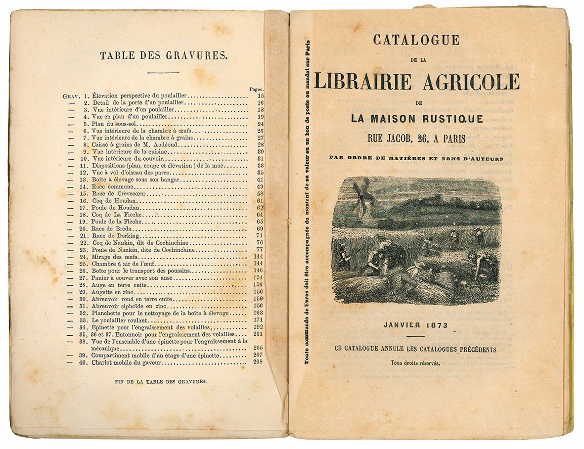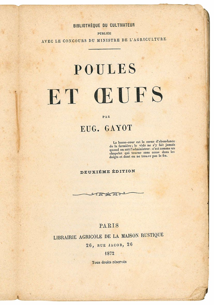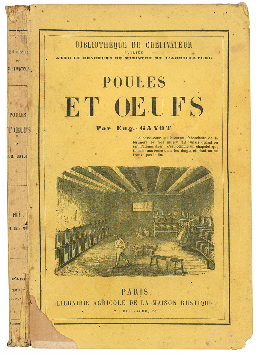 Poules et oeufs. Deuxième édition. Bibliothèque du Cultivateur, publiée avec le Concours du Ministre de l'Agriculture. (insieme a:) Catalogue de la Librairie Agricole de la Maison Rustique Rue Jacob, 26, a Paris. Janvier 1873.