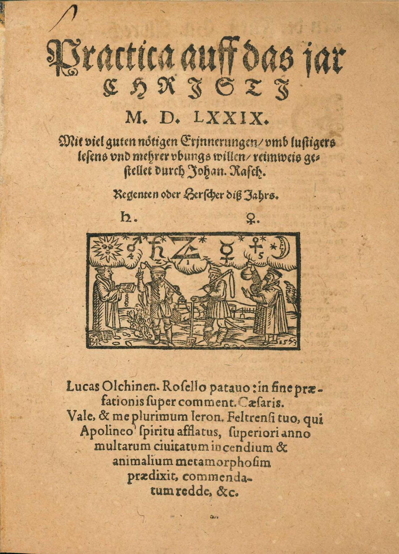 FIRST EDITION. Presented as a ‘Practica', i.e. a booklet containing astrological predictions, it is in reality a mocking poem on the genre, about which Rasch holds forth in even greater detail in his Gegenpractic of 1584.