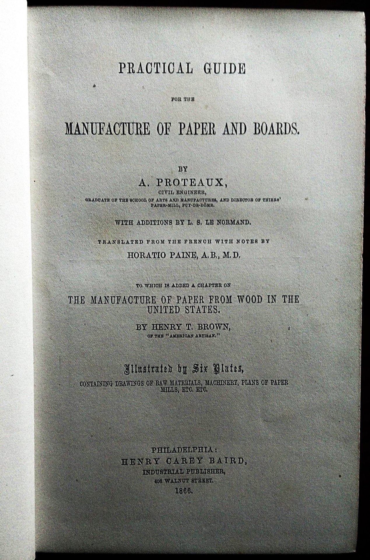 Practical guide for the manufacture of paper and boards. with additions by L. S. Le Normand. Translated from the french with notes by Horatio Paine...To which is added a chapter on the manifacture of paper from wood in the United States. By Henry T. Brown.