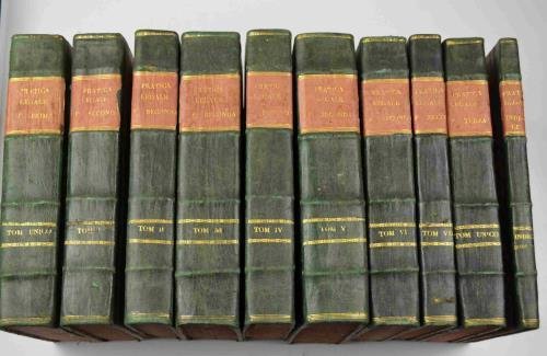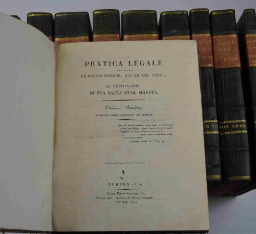 Quindici parti legate in dieci volumi di cm. 26, pp. xxvi, 272, (8) 546; 467; 608; 138 (6); 607, 761; (4) 523; 280; 103; 109 (7); (4) 238; 162 (16); 77 (1); (4) 111. Solida legatura coeva in mezza pelle verde con piccole punte, dorsi a nervi con fregi e titoli in oro su tasselli. Tagli spruzzati e piatti in carta spugnata. Qualche spellatura superficiali limitata ad un paio di piatti, peraltro esemplare complessivamente fresco, genuino ed in eccellente stato di conservazione. Ottima edizione ottocentesca di questa celebre opera appartenente alla tradizione giuridica del '700 piemontese. L'opera è attribuita a Pietro Gaetano Galli della Loggia, presidente del Governo Provvisorio del Piemonte, Consigliere di Stato a Parigi. Ampia compilazione, tuttora utile e curiosa per molte notizie storiche, cui collaborò anche il Senatore Gavuzzi, autore della nota parodia l'Adramiteno. Cfr. Melzi, II, p. 365.