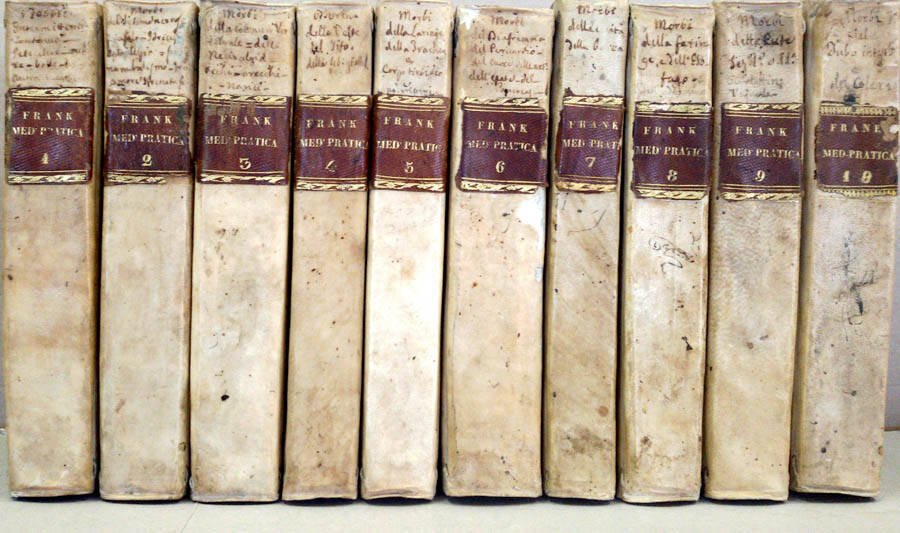 Opera completa in 10 volumi con mezza legatura in pergamena e cartonato con motivo marmorizzato, bottello in cuoio al dorso con titolo dorato, tagli colorati a spruzzo. Ritratti dell' autore all' antiporta del primo vol.e lettera dedicatoria stampata in corsivo dei tarduttori. Traduzione italiana su l' ultima edizione di Lipsiaa cura dei prof. Cav. Salvatore De Renzi e Pasquale Manfrè. Note manoscritte ai dorsi, pagine ben conservate, integre e pulite, da segnalare al vol. 7 piccoli fori di tarlo alle ultime pagine dell' indice. Opera rara Numero Pagine