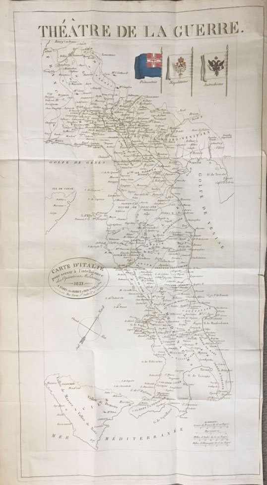 Paris, Roret et Roussel libraires, éditeurs de la collection des pensées et maximes des écrivains illustre, rue pavée Saint André des Arcs n. 9, 1821, in-8, br. originale con titolo su tassello a stampa appplicato sul dorso (dorso che reca lievi mancanze), pp. [4], II, 224. Con una grande carta della guerra incisa in rame più volte ripiegata (nell'angolo superiore destro sono presenti le tre bandiere degli eserciti coinvolti, tutte colorate a mano). Prima edizione. Barbier, Dictionnaire des ouvrages anonymes, vol. III, 985. Rare e leggere fioriture.