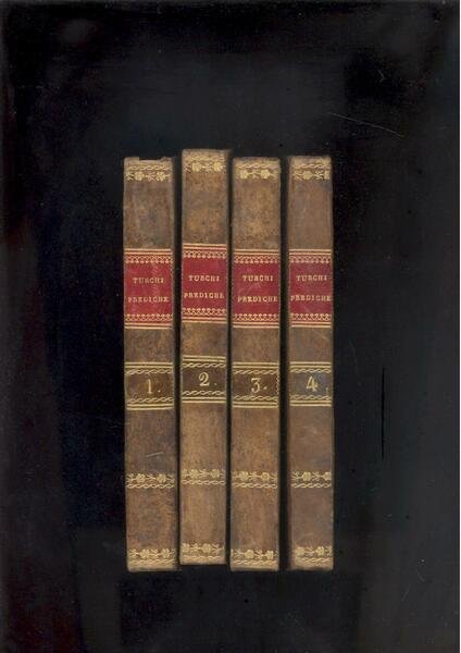 4 VOLUMI IN 16. VOL.1°, pp.319, VOL.2°, pp.304, VOL.3°, pp.292, VOL.4°, pp.279. LEGATURE D'EPOCA IN MEZZA PELLE CON TITOLI IN ORO ENTRO TASSELI ROSSI , VERDI PER IL N° DEI TOMI, FREGI IN ORO, PIATTI MARMORIZZATI. PREDICHE DI MONSIGNORE ADEODATO TURCHI<BR>DELL'ORDINE DE' CAPPUCCINI, VESCOVO DI PARMA. OTTIMA CONSERVAZIONE.ID 4041