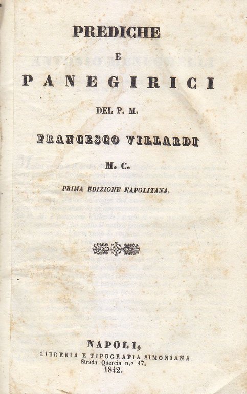PREDICHE E PANEGIRICI del Padre Francesco Villardi 1842 Simoniana libro antico