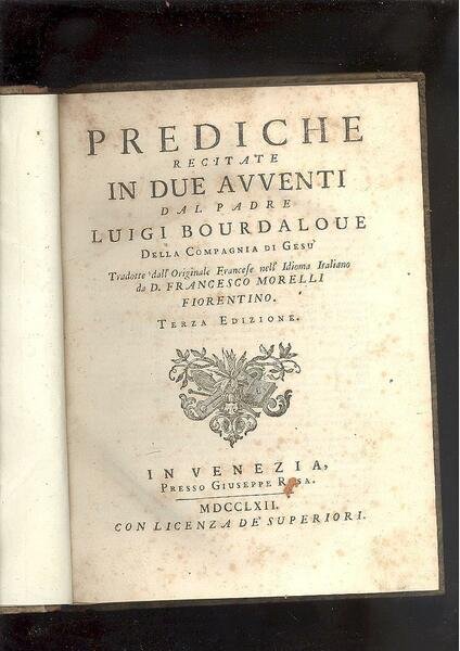 IN 8 ( cm.24 X 18 ), pp.XII, 228, LEGATURA D'EPOCA IN MEZZA PELLE CON TITOLO E FREGI IN ORO ENTRO TASSELLO VERDE, PIATTI MARMORIZZATI. FRONTESPIZIO INCISO, FINALINI E CAPILETTERA ISTORIATI. PADRE BOURDALOUE LOUIS ( 1632 - 1704 ), DELLA COMPAGNIA DI GESU', GESUITA E PREDICATORE FRANCESE. FU PREDICATORE A CORTE DI LUIGI XIV. VENNE CONSIDERATO COME IL PIU' GIANSENISTA TRA I MEMBRI SEICENTESCHI DELLA COMPAGNIA DI GESU' E, COME IL FONDATORE DELL'ELOQUENZA CRISTIANA IN FRANCIA.<BR>TERZA EDIZIONE. MINIME FIORITURE AL FRONTESPIZIO, ALTRIMENTI OTTIMA CONSERVAZIONE. TESTO SU DUE COLONNE. ID, 4073