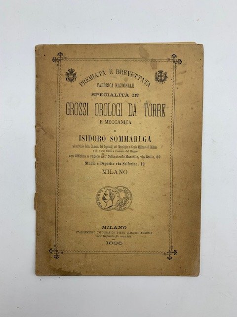 In 16 (cm 14,5 x 20), pp. 32. Leggera gora al margine interno delle carte. Brossura editoriale con illustrazioni al contropiatto anteriore (medaglie e premi vinti), al contropiatto posteriore e al piatto posteriore, con 25 illustrazioni nel testo anche a doppia pagina di orologi e dei loro meccanismi fra cui: orologi per torretta e stabilimenti industriali, sanitari, religiosi; orologi senza soneria per stazioni, palazzi municipali, privati; orologio a gran soneria ad ore e quarti con pendolo a compensazione premiato all'Esposizione di Parigi del 1878 (grande illustrazione su tavola doppia centrale); orologio da torre con soneria ad ore e mezz'ore a due cilindri; orologio orizzontale a gran soneria, a quattro cilindri; orologio da torre con soneria ad ore e quarti; modelli di armature in ferro per sostegno a campane e campanelle; ecc. Raro e importante catalogo di questa ditta specializzata meccanica nella produzione di orologi da torre. Da pagina 3 a pagina 6, e' presente un fitto elenco dei principali comuni, parrocchie, societa' e privati a cui la ditta forni' orologeria. Oltre a Milano, sono elencati molti comuni minori dell'Italia e - in fine - alcuni luoghi all'estero (America, Egitto, Grecia e India). La ditta Isidoro Sommaruga, poi passata nelle mani di Cesare Omboni, con sede a Milano, in via Solferino 12, partecipo' alle piu' importanti esposizioni dell'epoca con i propri congegni di precisione. Vantava l'esclusiva della costruzione di orologi da torre ed eccelleva nell'arte della cronometria riuscendo a conquistare riconoscimenti ed attestati internazionali.