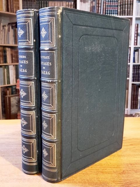 <span style="font-style: normal;">2 volumi in-8° (cm. 26,4), legature coeve in m. pelle verde con titoli e decorazioni in oro ai dorsi (minuscola spellatura), piatti in percallina verde decorati a secco, tagli dorati; pp.[4] 474 [2] con 54 tavole illustrative f.t., pp. [4] XVII [1b] 454 con 48 tavole illustrative f.t.; carte in perfetto stato e freschissime, numerose xilografie n.t. Sesta edizione dei </span><i>Premiers voyages</i> (1874) e terza edizione dei <i>Nouveaux voyages</i> (1870), classici della letteratura di montagna tra Svizzera e Italia che qui vengono proposti insieme. «Récits des excursions à travers les Alpes d'une carovane guidée par Töpffer» [Perret 4296]. Superbo insieme. (SN3)