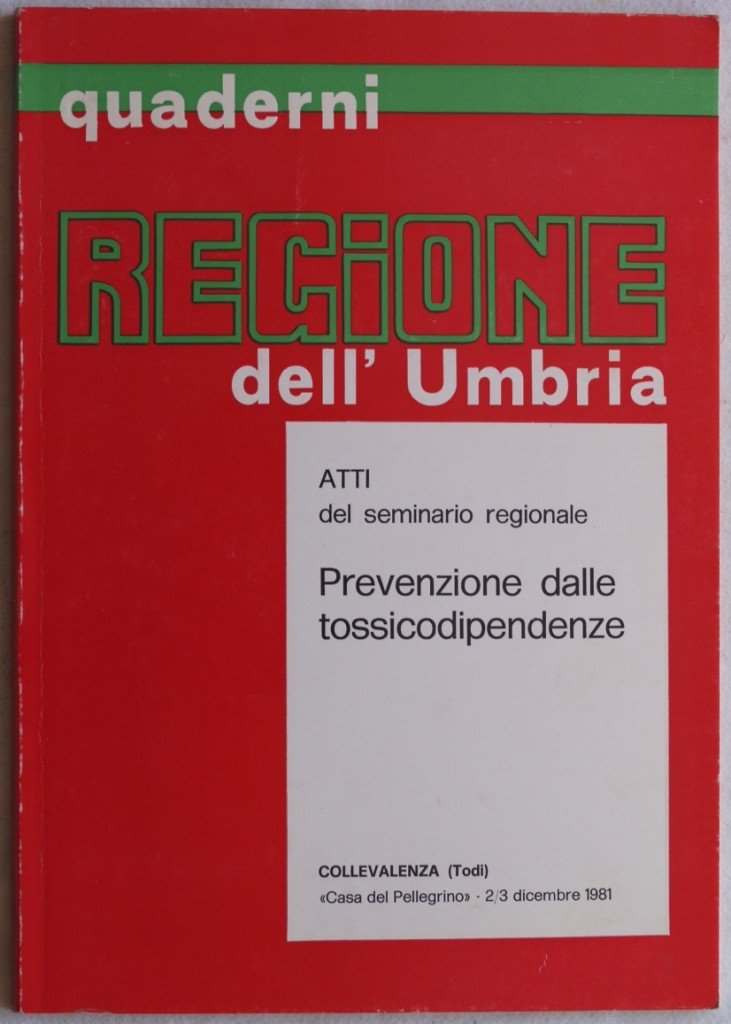 In 8. Dim. 24x17 cm. Pp. 99. Interessante pubblicazione del 1981, gli atti del seminario regionale sulla prevenzione delle tossicodipendenze. All'interno l'elenco dei partecipanti. Tra gli argomenti trattati: le istituzioni pubbliche per il recupero dei tossicodipendenti; la situazione della regione; la scuola nell'educazione per la prevenzione. In buone condizioni. Brossura editoriale in ottime condizioni generali con lievi usure ai margini e dorso. Interesting pamphlet of 1981, the acts of the regional seminary about the prevention of drug addictions. Inside the list of the participants. Among the issues treated: the public institutions for the dug addicted; the situation of the region; the school for the education in prevention. In good conditions. Editorial cover in very good general conditions slightly worn in the edges and spine.