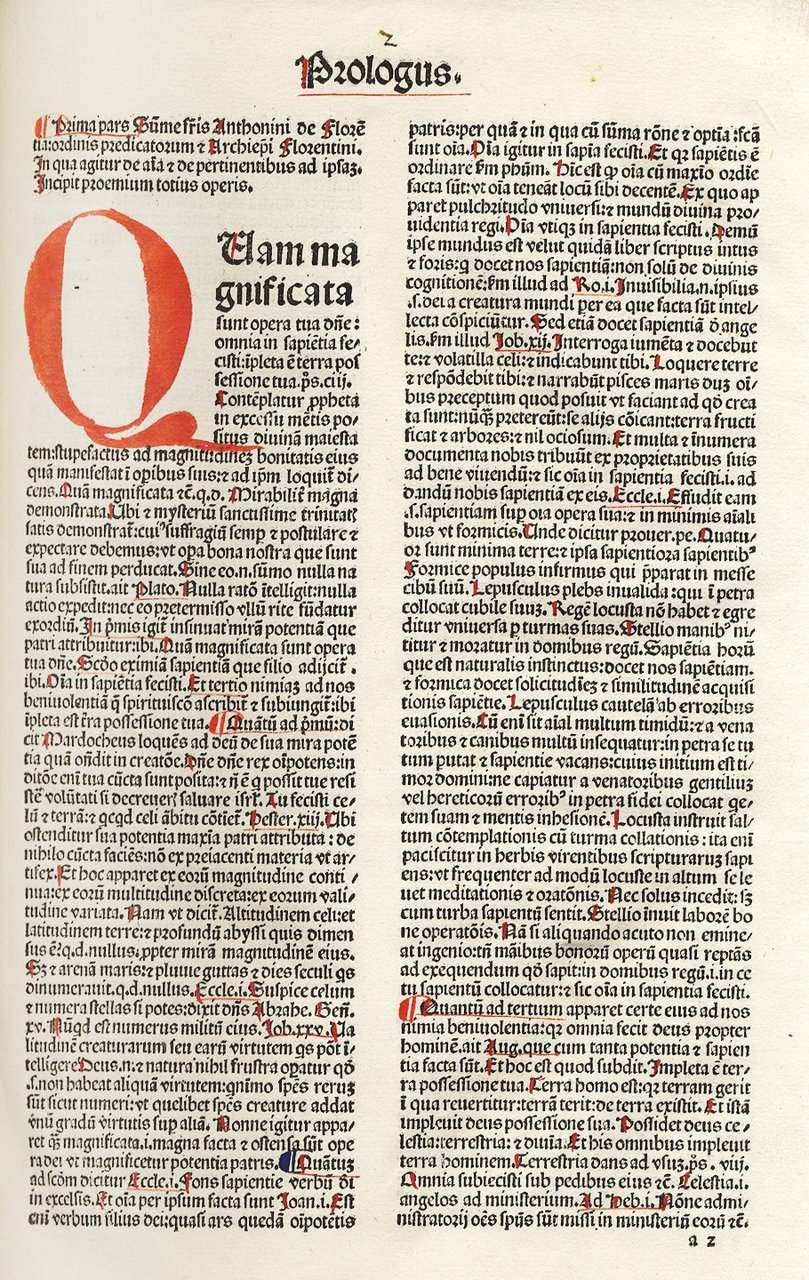 >2 parti in un volume in-folio, importante leg. del tempo uso monastico, piatti in assicelle ricoperti di pelle decorati a secco tramite rombi e 7 file alternate di cerchi col leone rampante e piccoli rombi col giglio; dorso a cinque nervi (con abili restauri alle cerniere ed alle cuffie). Testo in car. semigotico, su due colonne, interamente rubricato, con gran numero d'iniziali dipinte in rosso su cinque righe; 2 iniziali più grandi dipinte in rosso nella prima parte ed una magnifica grande iniziale all'inizio della seconda, dipinta in rosso e blu su tredici righe, con ramoscello di fiori e frutti color rosa all'interno. Edizioni assai rare delle prime due parti della ''Summa theologica''; la Pars II, in particolare, è l'unica pubblicata dagli stampatori Joh. de Colonia e Joh. Manthen e seconda ediz. in assoluto di questa parte dell'opera (che si compone di 4 parti ed apparve completa per la prima volta a Norimberga, A. Koberger, 1477-79). La ''Summa'' è l'opera capitale di S. Antonino (Firenze 1389 - 1459, frate domenicano, arcivescovo di Firenze dal 1445, dai suoi concittadini inviato in varie missioni diplomatiche presso vari Pontefici) con cui esercitò un grande influsso fino al 1600; ebbe 20 edizioni complete dal 1477 (Norimberga e Venezia) al 1740 e moltissime altre incomplete. ''Importante sotto l'aspetto teologico-morale ed etico-economico, persegue un fine più pratico che teorico...'' (M. Grabmann, Storai teol. catt., Milano, 1939, p. 138). - Prima parte: ff. (240, il primo bianco presente; con segnatura). F. 2r., titolo: ''Prima pars summe fratris Anthonini de Florentia ordinis predicatorum et Archiepiscopi Florentini...''; f. 239 v., colophon: ''Hic finis prime partis...Impressionique dedite venetijs per Leonardum Wild de Ratisbona. M.cccc.lxxxi...''; f. 240r.: ''Registrum prime partis''. - Seconda parte: ff. (366, il primo bianco presente; con segnatura). F. 2r., titolo: ''Clarissimi ac doctissimi viri fratris Anthonini...secunda pars summe...''; f. 364r., colophon: ''Impressum est opus...Venetijs impensis Johannis de Colonia sociique eius Johannis Manthen de Gherretzem. M.cccc.lxxvij''; f. 366r.: ''Registrum 2e partis...''. - Esemplare stupendo, impresso con somma cura su carta forte, a grandi margini, immacolato (solo il f. s8 della prima parte presenta sensibili macchie d'umidità). Con attestazione mss. coeva di possesso dei Domenicani di S. Pantaleo, Weidenbach presso Colonia. I) BMC V, 266. Goff A-873. IGI 691. HC 1244. GW 2187. Pellechet 879. Manca a Oates.- II) BMC V, 228. Goff A-868. IGI 700. HC 1255. GW 2196. Pell 888. Oates 1725. Pr 4323. Non in Polain.