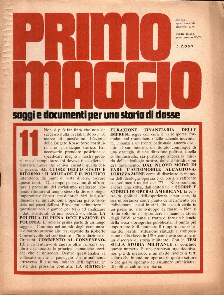 "Primo Maggio n. 11. Saggi e documenti per una storia di classe", edizione inverno 1977/1978, pp. 63, formato 21 x 28.