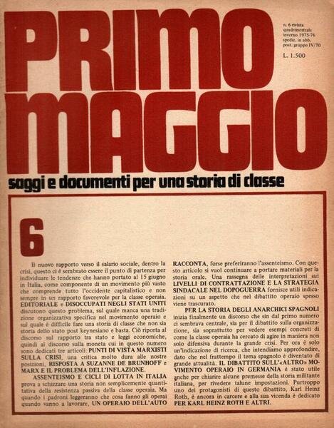 "Primo Maggio n. 6. Saggi e documenti per una storia di classe", edizione inverno 1975/1976, pp. 95, formato 21 x 27.