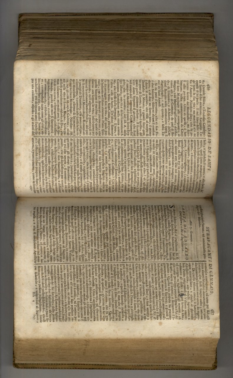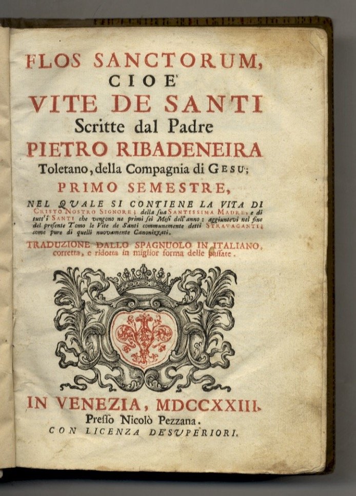 In Venezia, presso Nicolo Pezzana, 1723, in-4, legatura del primo novecento in mezza pergamena, titolo manoscritto al dorso, pp. [32], 766 [2], l'ultima carta bianca. Solo primo semmestre di "Flos sanctorum, cioè vite de' Santi scritte dal padre Pietro Ribadeneira"; manca il secondo semestre.