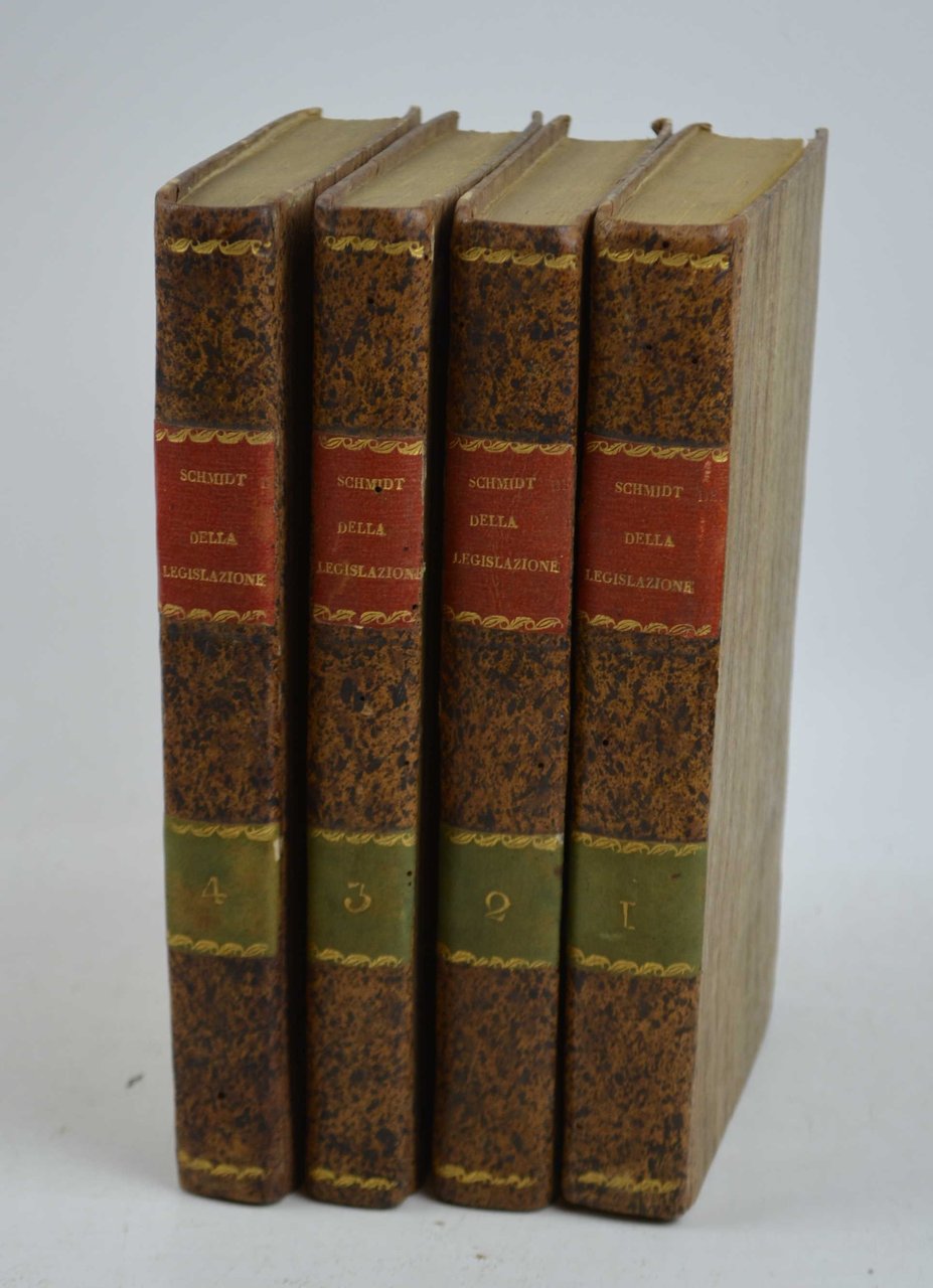 Quattro volumi di cm. 19,5, pp. 1.000 ca. complessive. Bel frontespizio inquadrato da cornice decorativa a ciascun volume. Solida ed elegante legatura del tempo in cart. decorato con fergi in oro e titoli su doppi tasselli bicolore. Qualche leggera e rada brunitura, ma esemplare particolarmente ben conservato. Elegante edizione settecentesca di questo classico testo che si inserisce pienamente nella tradizione del pensiero giuridico settecentesco. L'autore (Schmidt von Auenstein 1720-1805) fu giurista, filosofo ed economista.