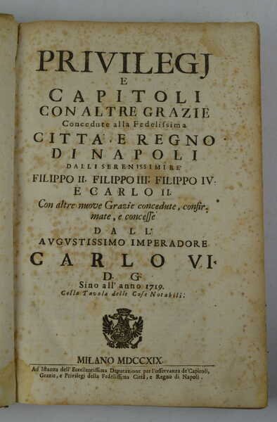 Privilegj e Capitoli con altre grazie Concedute all Fedelissima Città e Regno di Napoli dalli Serenissimi Re' Filippo II, Filippo III, Filippo IV e Carlo V… sino all'anno 1719…