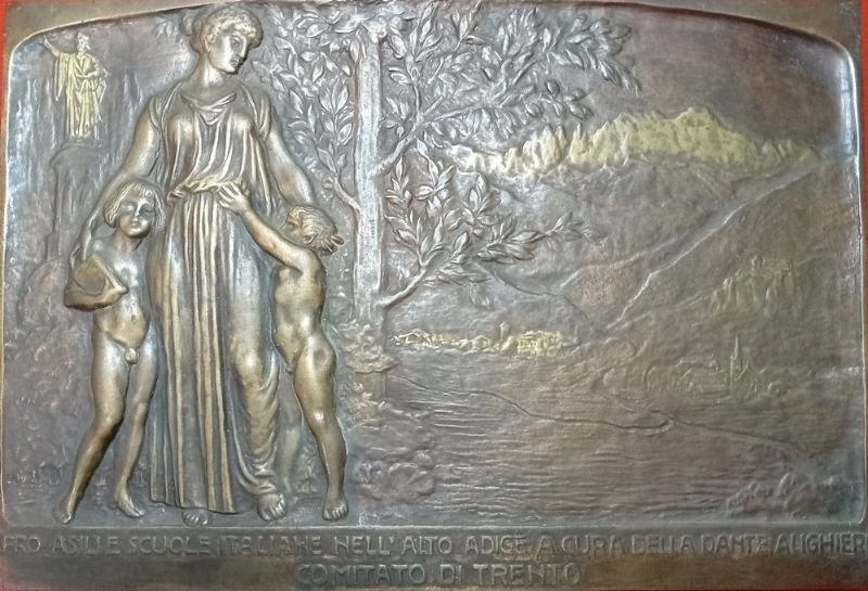Bella placca in bronzo fuso, cm. 30x20,5, allegoria in bassorilievo in primo piano, statua di Dante e veduta panoramica, 'Monti, Albero e villaggio', sullo sfondo.