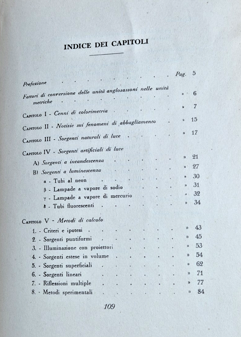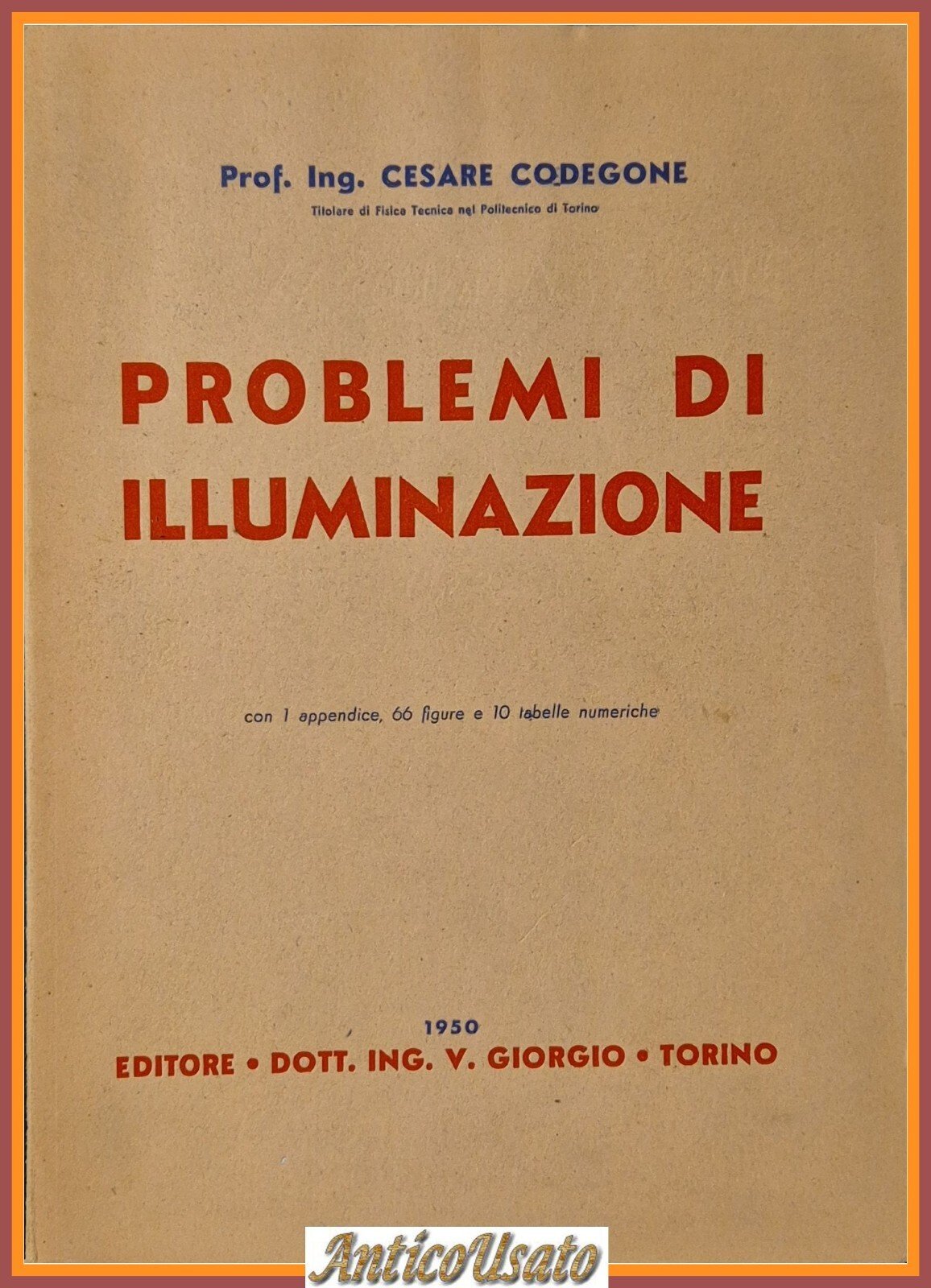 PROBLEMI DI ILLUMINAZIONE di Cesare Codegone, titolare di Fisica Tecnica nel Politecnico di Torino. Dott. Ing. V. Giorgio Editore, 1950 . 109 pagine, con 1 appendice, 66 figure nel testo e 10 tabelle numeriche. Copertina editoriale in brossura. Stato di conservazione: molto buono (pagine normalmente ingiallite, poche sottolineature a matita colorata, poche chiose a matita) Libro usato saggistica ingegneria