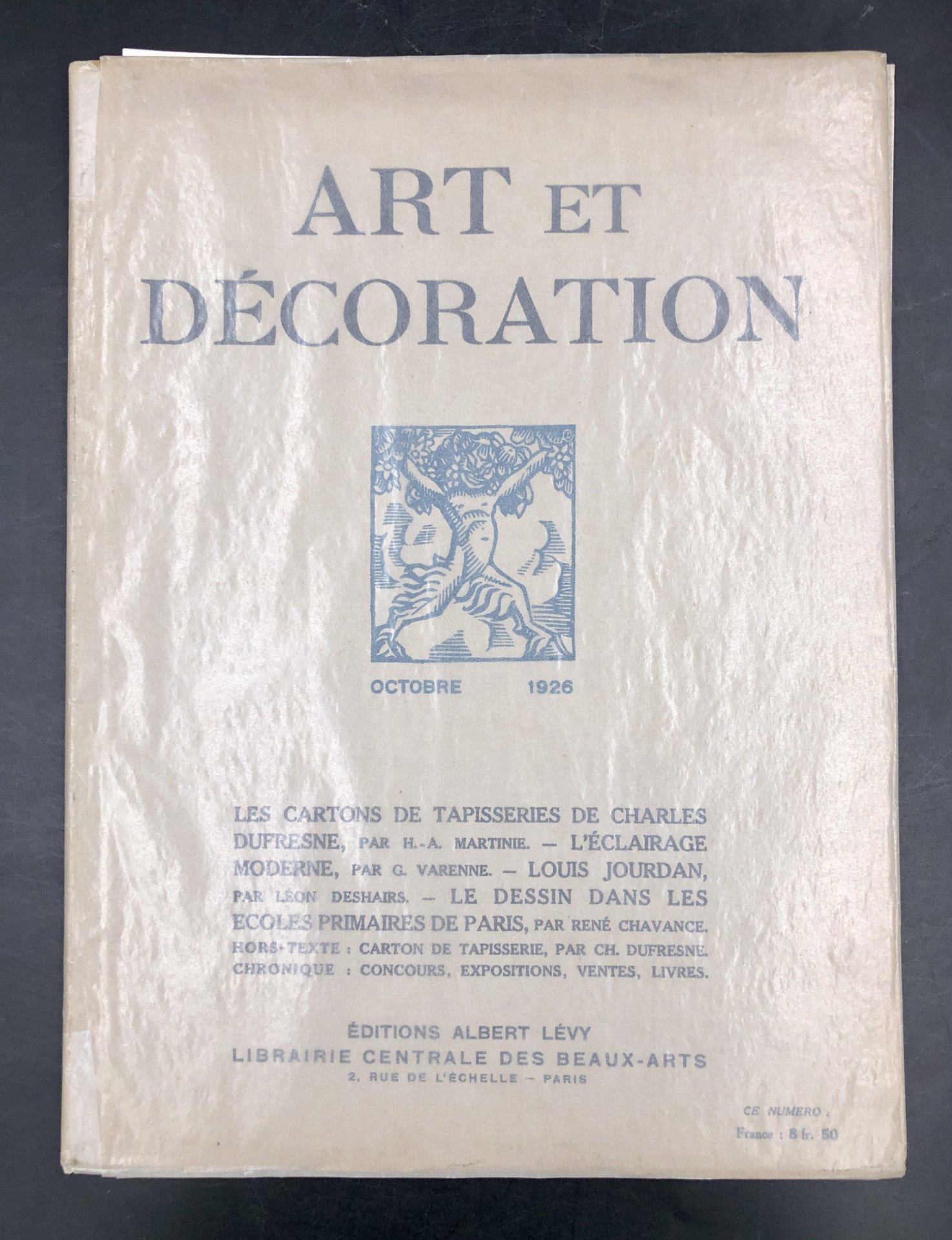 Il saggio sull'ILLUMINAZIONE DECO occupa 10 pagine con 16 FOTO in bianco e nero di lampadari e lampade (design di Chareau, Perzel, Genet et Michon, Dominique, Tony et Jacques Socard, Péjac. Il fasc. in-4° (cm. 30x22), cartoncino leggero edit., ill., fodera editoriale in velina, è completo delle sue 32 pagine + pp. 8 di rubriche, e contiene: 1) Les CARTONS de TAPISSERIES de Charles DUFRESNE. 8 pp. con 8 riprod. in bianco e nero + 1 TAVOLA a COLORI fuori testo. 2) Louis JOURDAN, 6 pp. con 7 riprod. 3) L'enseignement du DESSIN dans les écoles primaires de Paris. 10 pp. con 21 foto di disegni ed elaborati oggetti di gusto decisamente déco.