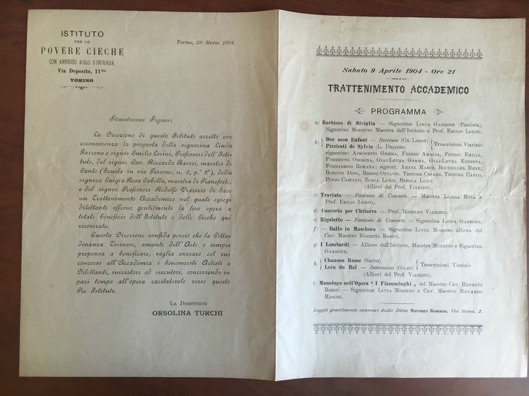 Programma concerto Istituto Povere Cieche Torino 1904 - E21689