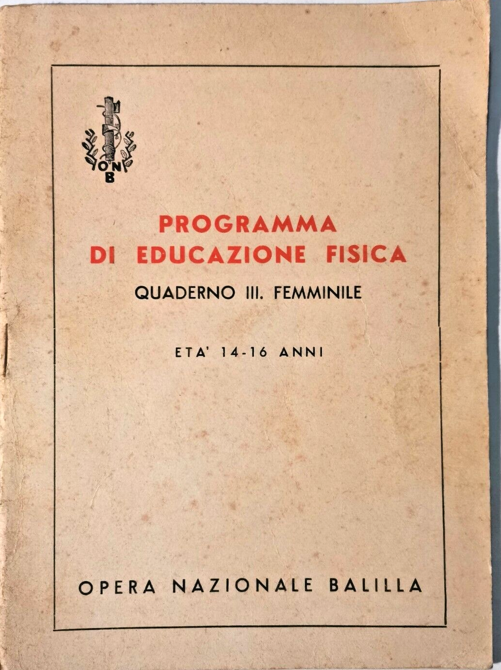 Programma Di Educazione Fisica, Quaderno Terzo Femminile, Opera Nazionale Balilla. Età 14 - 16 anni. 40 pagine + 4 tavole fuori testo a fine volume con fotografie degli esercizi. copertina editoriale in brossura. Stato di conservazione: molto buono (pagine ingiallite, firma di appartenenza)