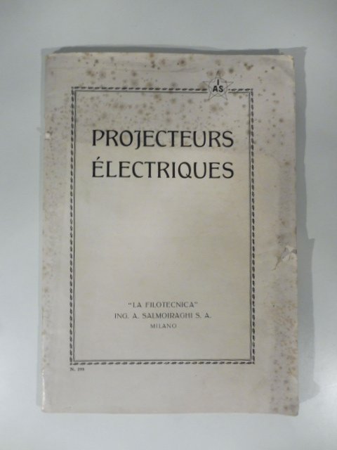 In 8 (cm 17 x 24), pp. (50) comprese le copertine con illustrazioni nel testo. Diffuse bruniture ai piatti. Catalogo in lingua francese della Filotecnica Salmoiraghi comprendente: miroirs pour projecteurs, miroirs paraboliques, disperseurs, lampes pour projecteurs, projecteurs pour marine marchande. La parte finale comprende illustrazioni di diversi modelli di proiettori per le stazioni fotoelettriche per l'esercito e la marina. Catalogo non datato ma ascrivibile agli anni Trenta.