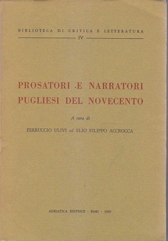 PROSATORI E NARRATORI PUGLIESI DEL NOVECENTO di Ulivi Accrocca 1969 Libro