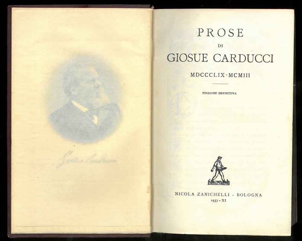 <p>20 cm, rilegatura editoriale in piena tela, titolo e fregi impressi in oro al piatto e al dorso in cornice tipografica dorata, tagli superiori colorati, p. 1485. Capolettera, testatine e finalini ornati a motivo floreale. Con 3 tavole più volte ripiegate di fac simili di manoscritti carducciani. Ritratto dell'autore in nero all'antiporta protetto da velina.</p>