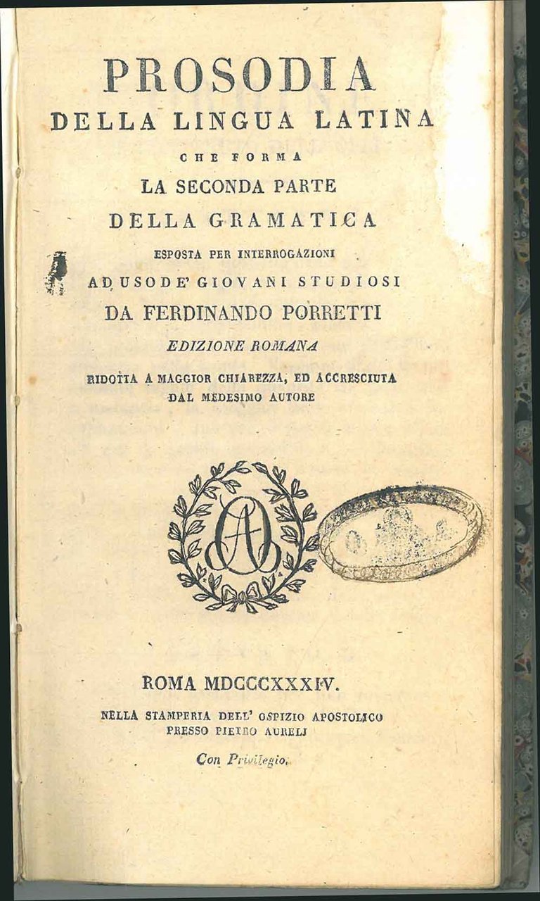 Prosodia della lingua latina che forma la seconda parte della grammatica esposta per interrogazioni ad uso de' giovani studiosi da Ferdinando Porretti. Edizione romana ridotta a maggior chiarezza, ed accresciuta dal medesimo autore