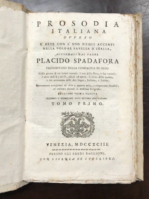 2 volumi in 1 in-8° (cm. 20), legatura coeva in cartonato d'attesa con titolo ms. al dorso, pp. XXXII 154 [2b], 212 in buono stato e in barbe; lievi fioriture sparse. Vocabolario prosodico con dissertazioni iniziali sulla pronuncia corretta, in particolare della consonante Zeta e delle vocali aperte o chiuse. Buon esemplare. (NF1)