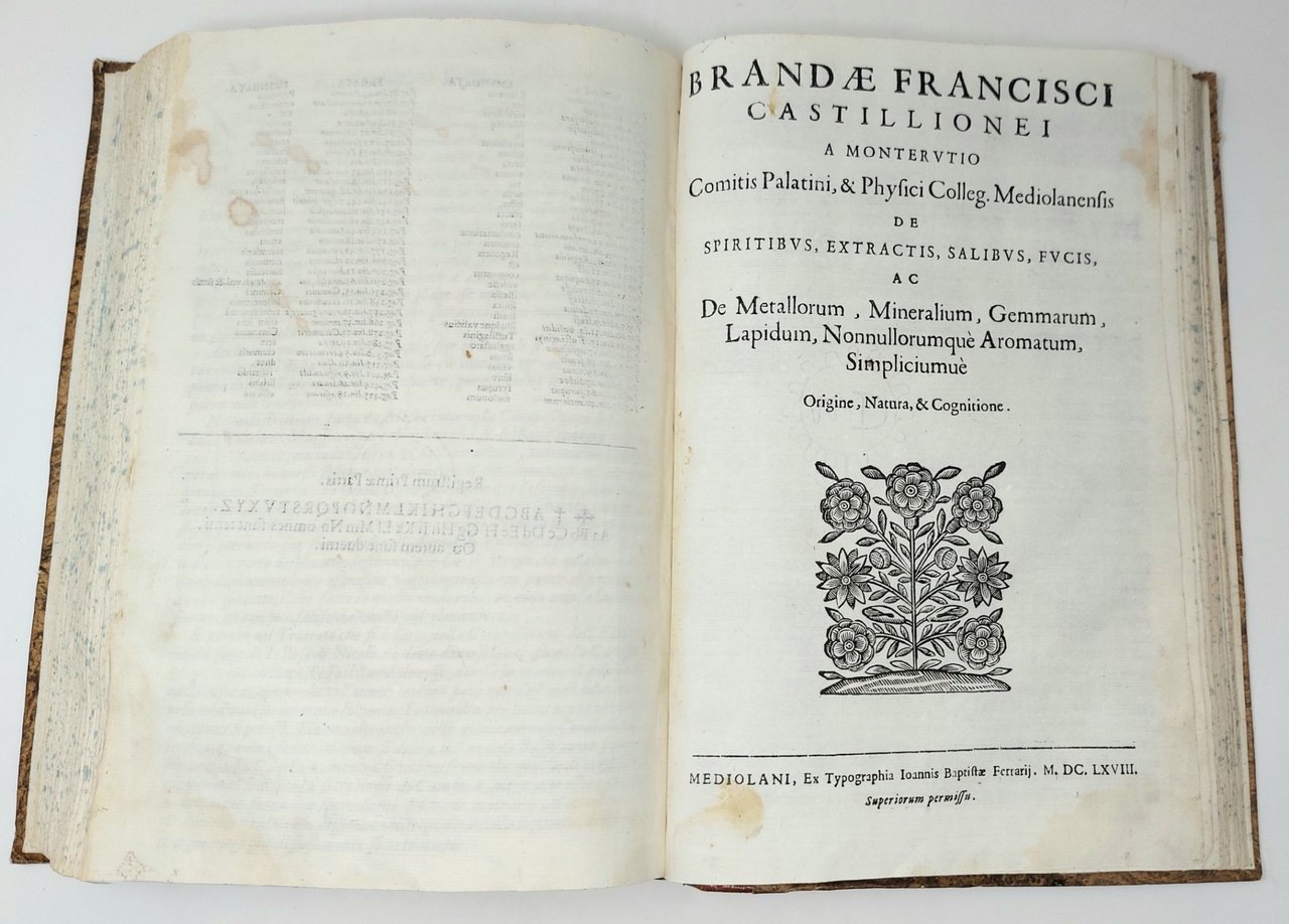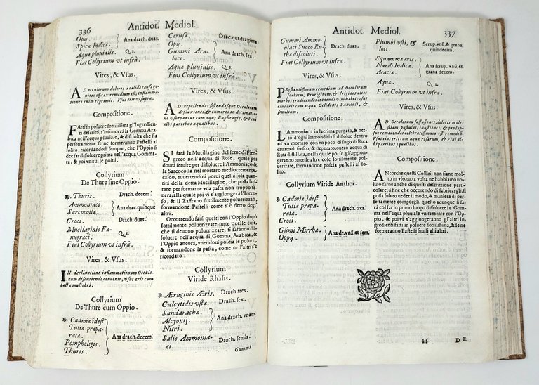 >2 parti in 1 vol. in-folio (290x190 mm), pp. (24), 438, (2), privo dell'antiporta fig.; pp. (6), 102 (i.e 94, omesse nella numerazione le pp. 81-88), iniziali ornate e cul-de-lampe in xilografia. Legatura moderna in m. pelle, carta moucheté ai piatti, titolo e fregi in oro al dorso, tagli spruzzati. Precede l'opera dedica al Senato milanese e versi latini di Angelo Maria Calvi e di anonimo. Prima edizione di questo celebre trattato farmaceutico in italiano (titolo, dedica e versi in latino), importante e utile ricettario per preparazioni generali e particolari (delle pillole, dei vini medicali, delle polveri, degli unguenti, dei cerotti, degli sciroppi...); la sezione dedicata ai composti tratti da metalli, minerali, gemme e pietre ha proprio frontespizio e numerazione. Discreto esemplare, complessivamente fresco e genuino, ex-libris manoscritto al frontespizio e breve nota al verso dell'ultima b. (rifilato il margine inferiore, con piccola perdita di testo a p.41; macchie alle pp. 57-58 della seconda parte). Vinciana 1872 e 1873 a sottolineare l’esaustività del testo. Argelati 374-375. Blake, 81.